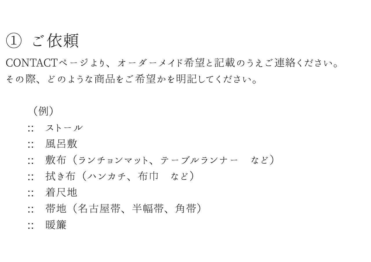::: オーダーメイドご注文品について、可能な限りサンプル生地に近い厚みになるよう努めますが、必ずしもサンプルと同じ厚みや風合いなるとは限りません。手紡ぎ・手織りの特性をご理解いただき、あくまで参考としてご確認いただきますようお願いいたします。