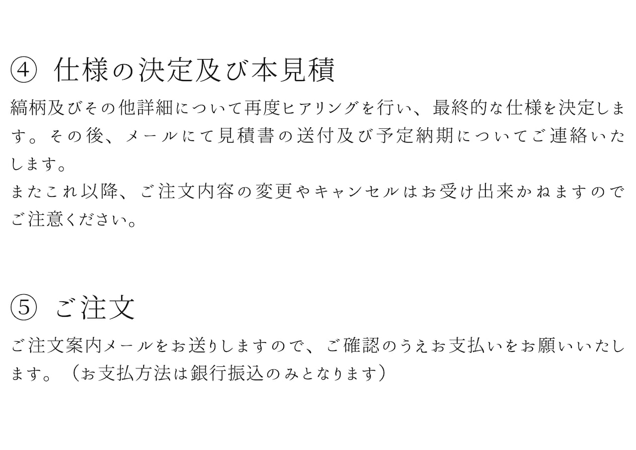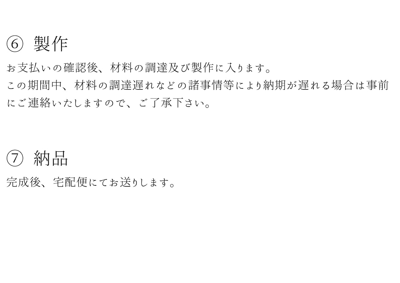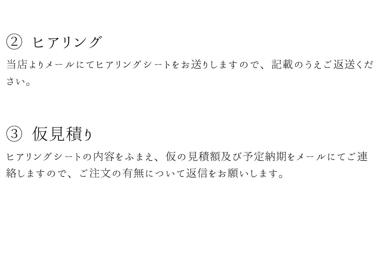 オーダーについては、写真に掲載している順序でのご案内となります。以下の内容と合わせて、必ず事前にご確認いただきますようお願いいたします。確認漏れによるキャンセル・返品・交換はお受け出来ませんので、ご了承ください。